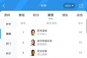 体育资讯10月27日讯 中甲第28轮战罢,助攻榜方面,邦本宜裕以17次领跑榜单,本轮均收获一次助攻的尼古拉斯和埃尔阿兹拉克并列第二,安以恩和帕洛切维奇分列第四、第五位。