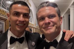 照片中,C罗与赫格塞思手搭着肩,笑容灿烂。