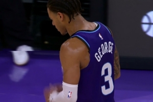 球感无敌!库里反跑过掉乔治 接球高打板挑篮越过努尔基奇命中!